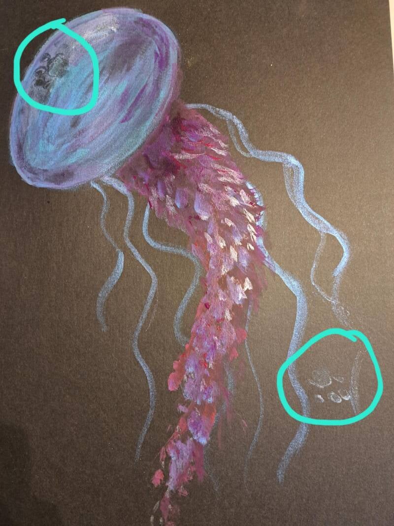 Het was even zoeken, ik dacht meteen met deze kleuren op zwart papier te kunnen werken. Maar ik had toch de hulp nodig van plakkaatverf (gouache) om de achtergrond wat sterker op te zetten. Ik ben gek op de wereld in de diepzee, al die prachtige dieren die daar nog niet allemaal ontdekt zijn. Dus ik besloot om een kwal te maken. Leek mij perfect voor deze glimmende verf. En dit is het resultaat! Wat vind je ervan?