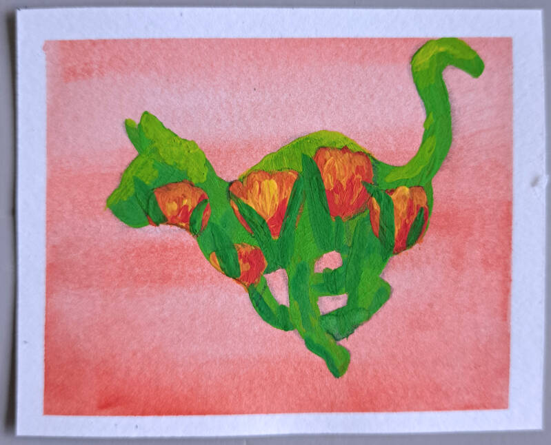 Ik nam een voorbeeld aan dit idee. Ik was jaren geleden tijdens de bloemendagen in ons dorp, begonnen aan vijf silhouetten van katten. Ik wilde deze vullen met de bloemen die we hier zien op de bollenvelden om ons (t)huis heen. En kijk! ZE ZIJN AF! Precies voor dit soort dingen is de tekenclub opgericht! Tijd maken om je projecten af te maken, je ideeën te tekenen! Tijd voor jezelf en je brein!