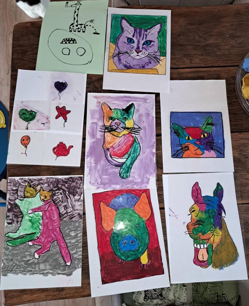 De kinderen zijn aan de gang gegaan met hun eigen huisdieren, dieren uit de dierentuin en kleurplaten van dierenkoppen. (Dat is een goede om mee te starten voor wat jongere kinderen, om ze een kleurplaat te geven omdat de lijnen zo makkelijker te volgen zijn i.p.v. een foto).