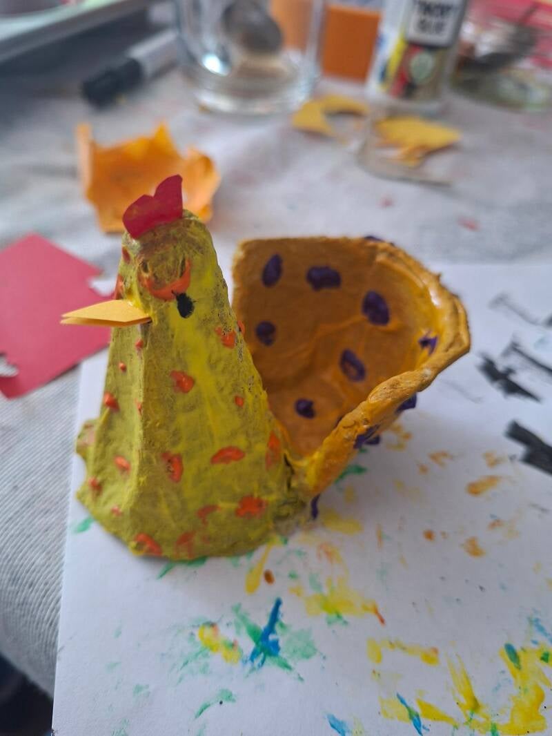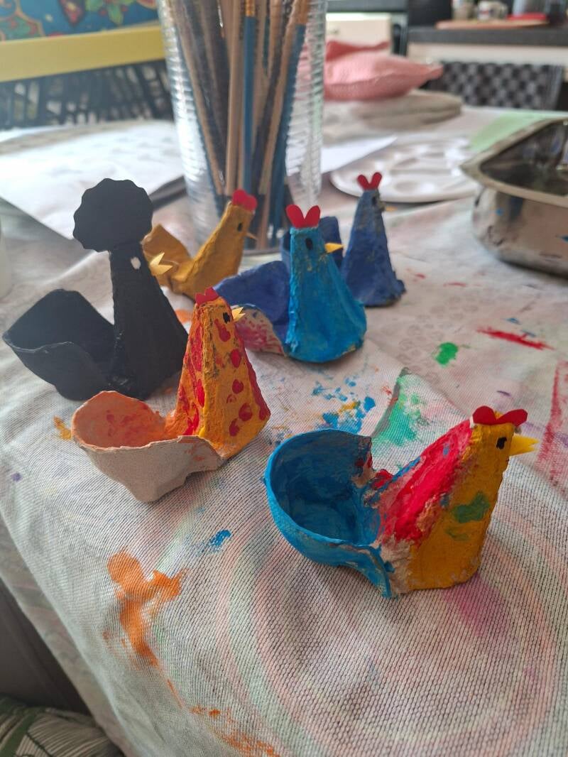 De tekeningen op dit plastic zorgt ervoor dat het een hele tijd duurt voordat de schilderijen droog zijn. Daarom hebben we alles ergens hoog in huis te drogen gelegd en zijn we nog wat eier-kippetjes gaan maken. Ken je die?