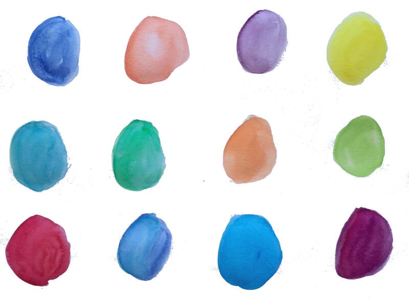 Omdat er tijdens de tekenmiddagen veel vragen zijn over kleurgebruik met verschillende materialen, heb ik ook een oefening gemaakt waarbij dit heel goed geoefend kan worden. Ik heb met aquarelverf kleur 'blobs' gemaakt. Ik heb verschillende kleuren gemaakt door basiskleuren te mengen. Dit is een hele fijne oefening om om te leren gaan met kleuren mengen. Daarna heb ik met kleurpotloden de schelpen vorm en versiering gegeven.