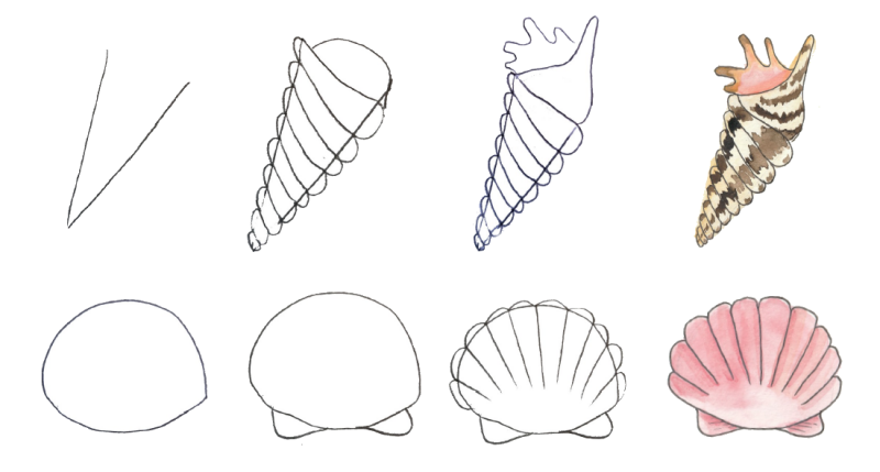 Schelpen zijn goed te tekenen in een stap-voor-stap manier. Ik heb een aantal schelpen uitgezocht om stap voor stap te gaan tekenen. Doe je mee? Hieronder vind je er twee soorten schelpen, maar in de PDF die onderin dit blogje staat, die je kunt downloaden om thuis mee aan de gang te gaan, staan er veel meer.